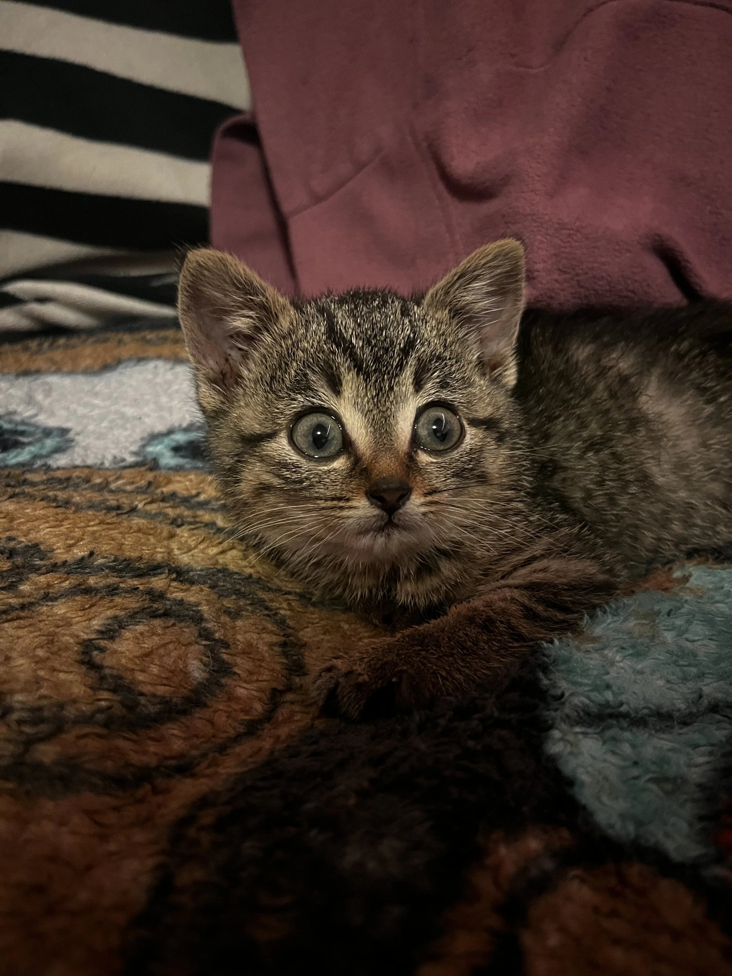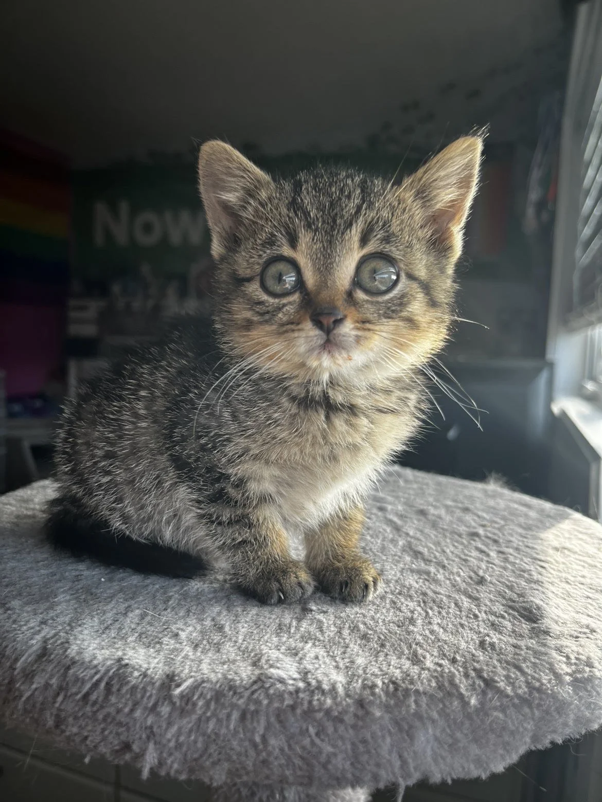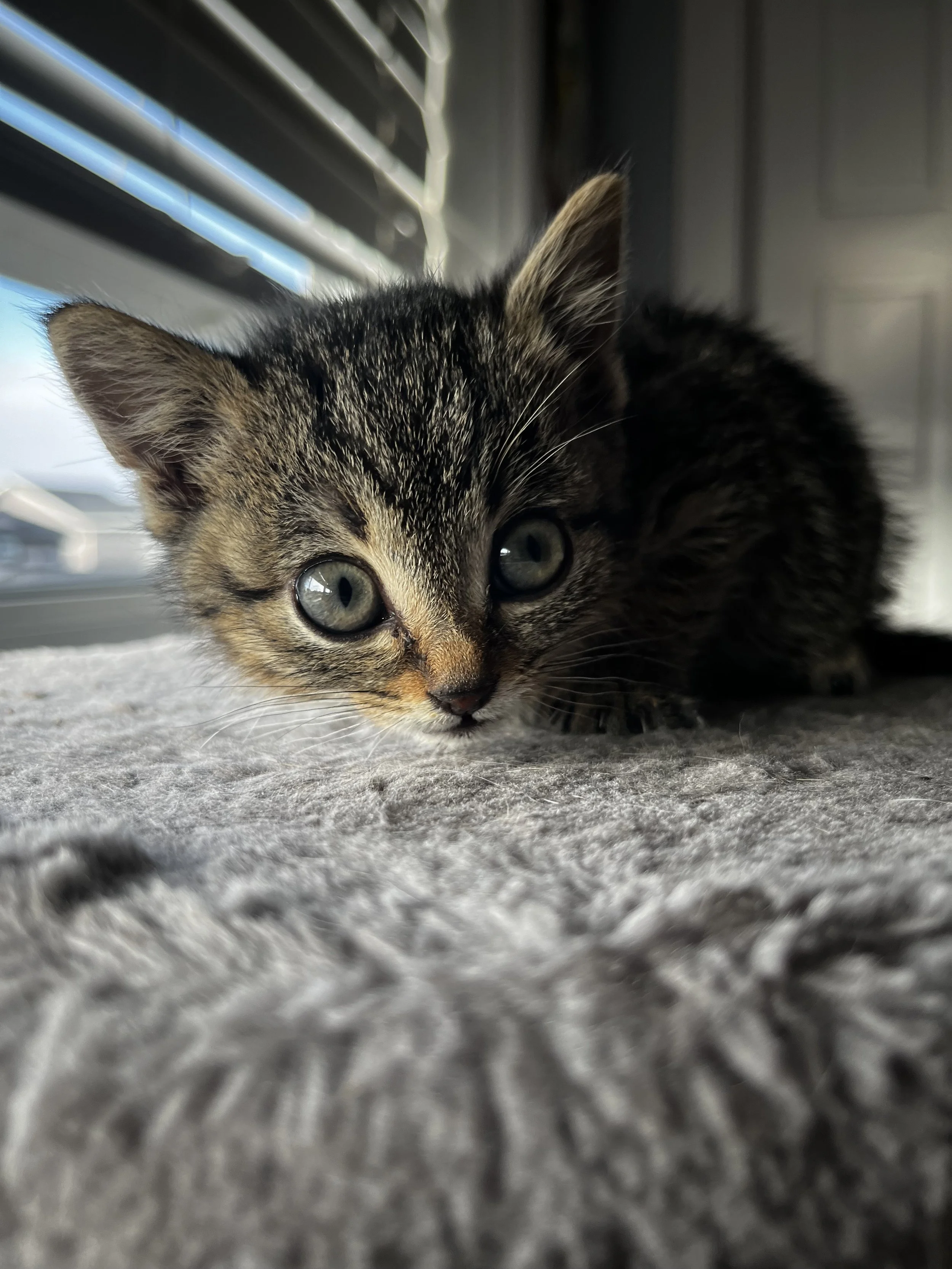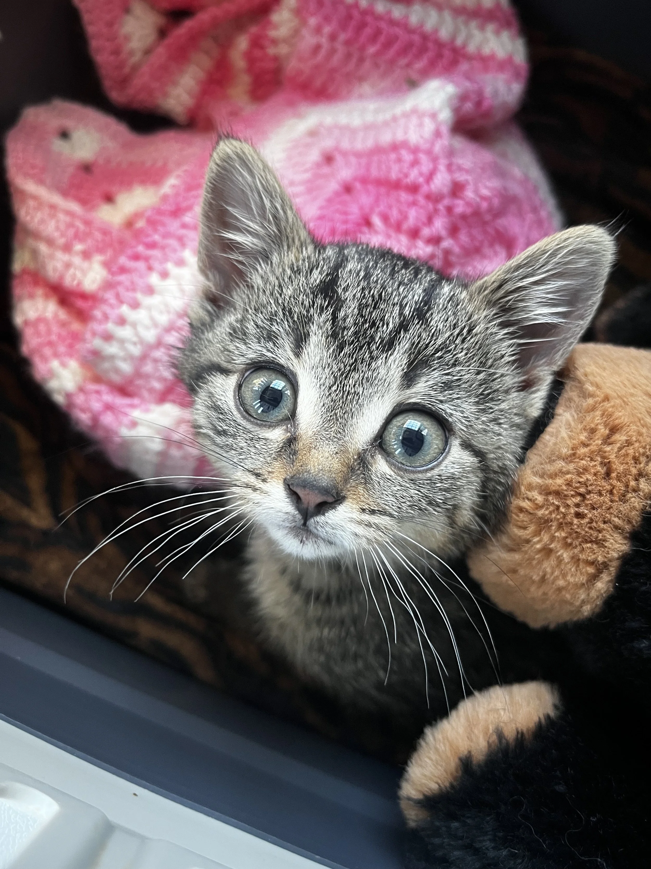 Meet Kabob, a sweet and gentle foster kitten with a heart as soft as her purr. This calm little girl loves nothing more than being carried around like a baby, soaking up all the cuddles and affection she can get. Bobbers (Kabob) also loves being a shoulder cat and will hangout while you complete tasks. Though she has slightly poor vision, Kabob doesn’t let that slow her down. She’s perfectly content exploring the world at her own relaxed pace, until she gets lost.