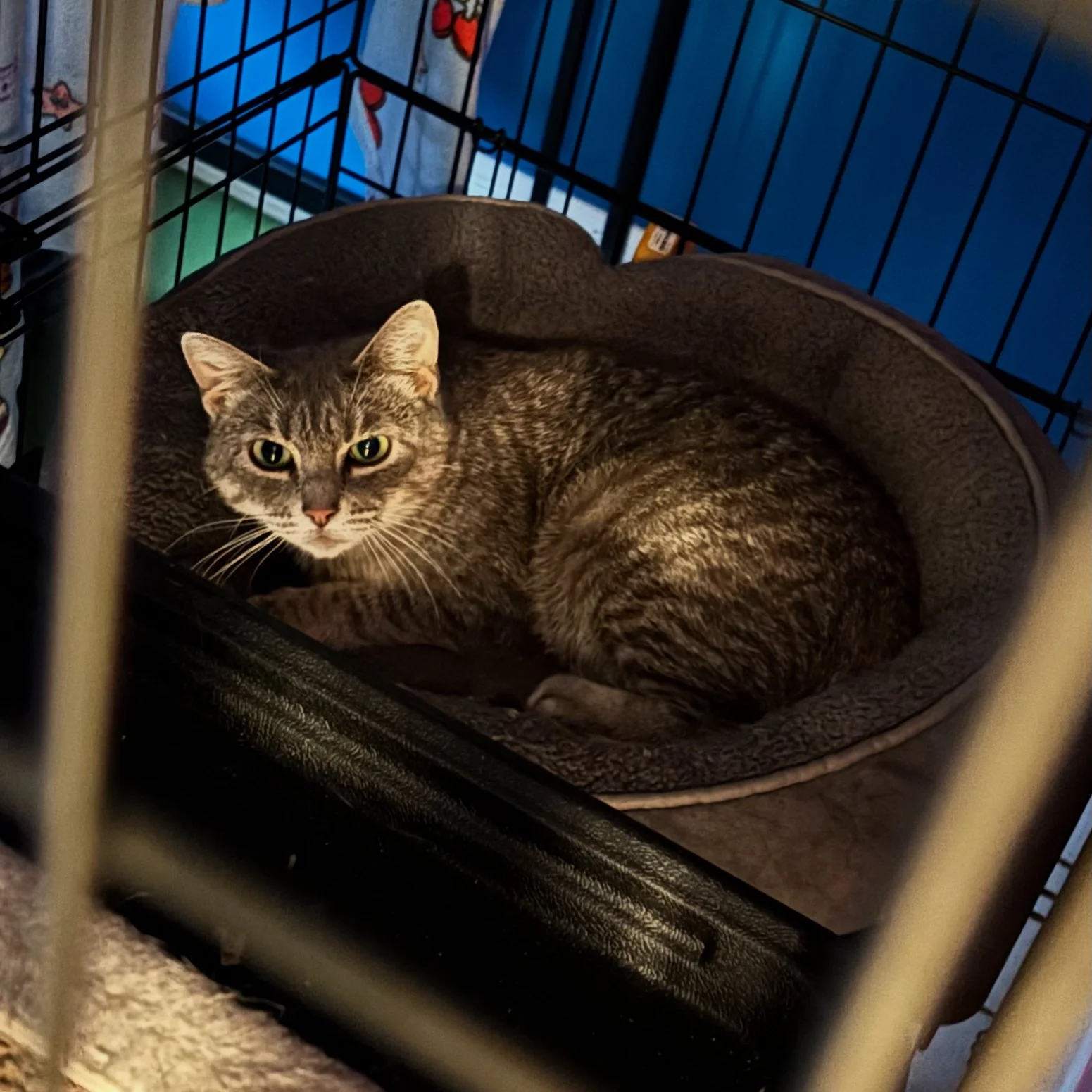 Nervous Nellie has been with SCAT since April 2025. She is still very unsure about people but is very gradually learning that it is safe to move around her foster room. She retreats to her safe hiding spot when she feels nervous.