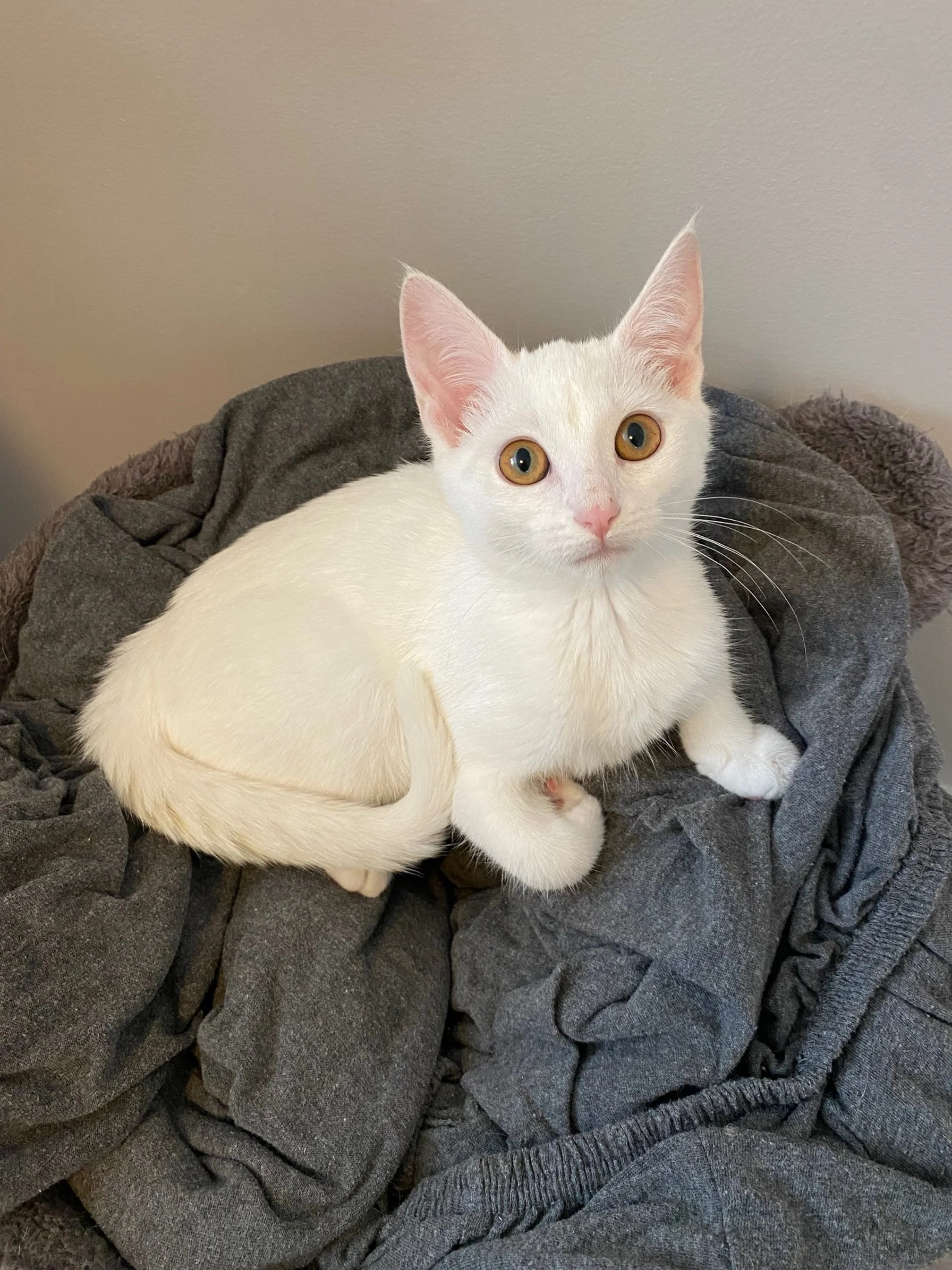 Oleander is an all-in kind of girl. She goes full tilt for her toys, snack time, and cozy naps. She can be a little nervous when she first arrives somewhere new, but once she feels safe, her goofy and loving side really shines through. She’s the type of kitten who’s 100% worth the wait.