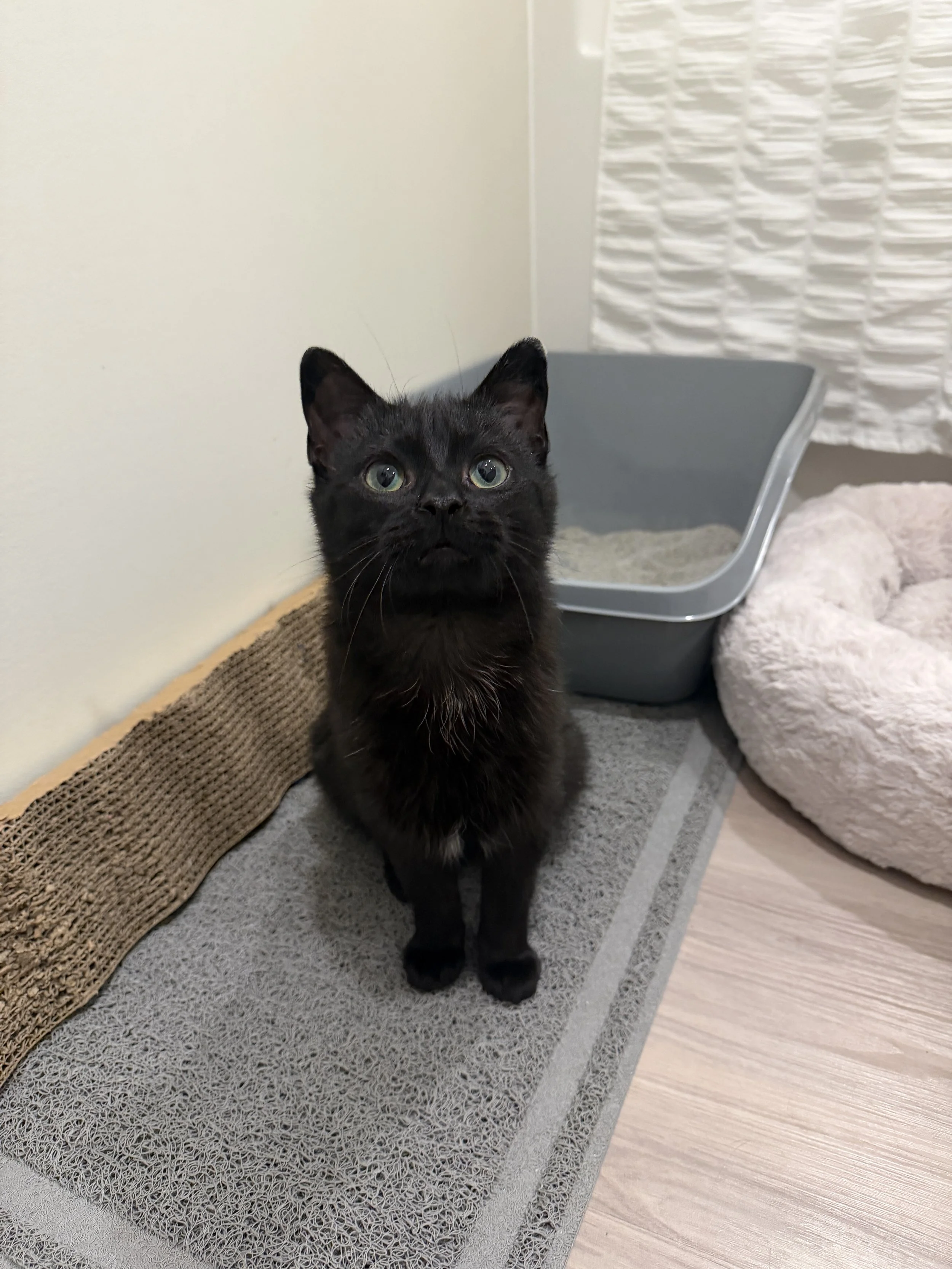 Likes: Cuddles, track and scratch toys, fleece strings, treats