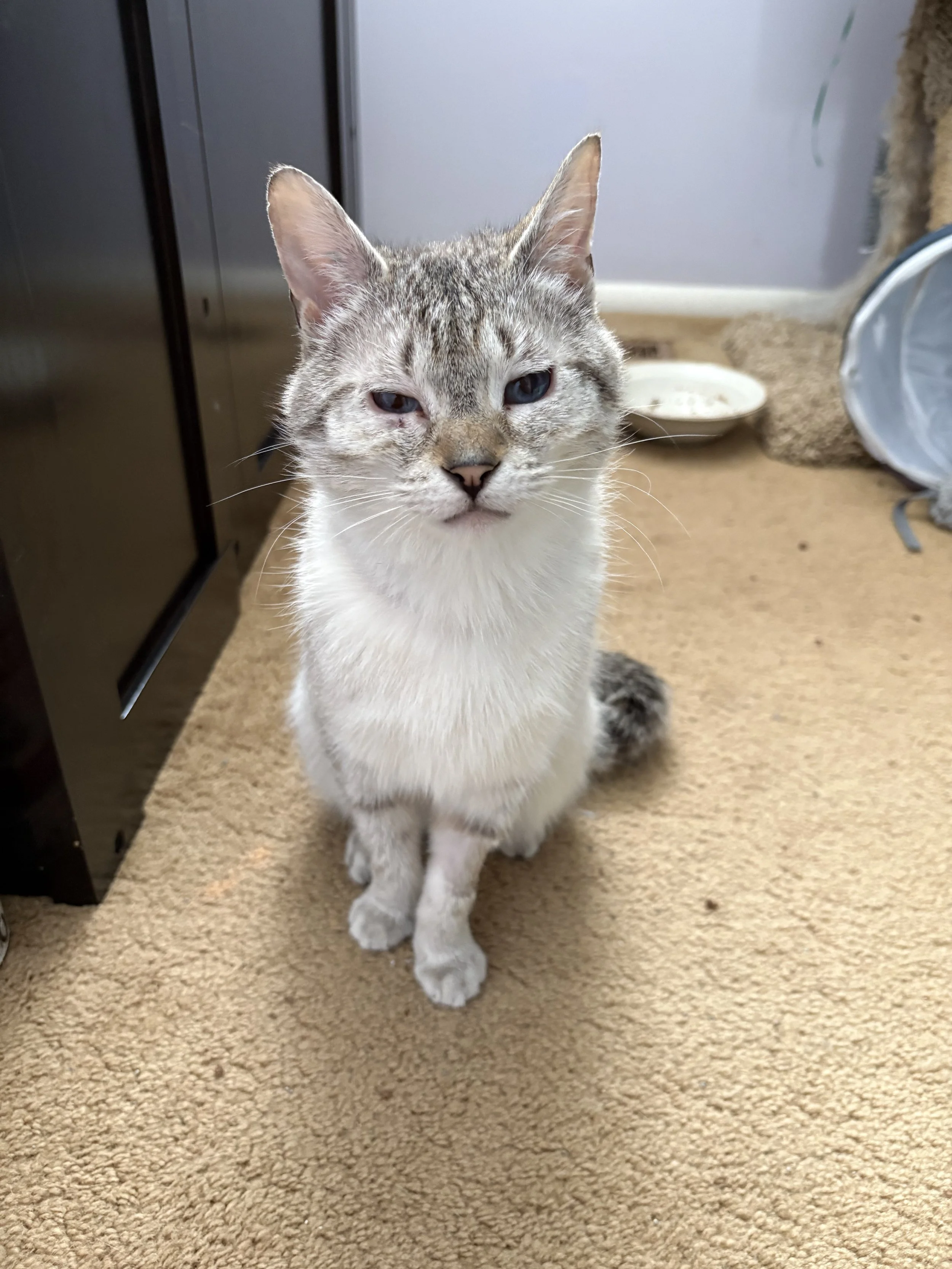 Pagoda (AKA Pog) is a tiny kitty with a big, silly personality. She came from a tough situation in Wynyard where she was one of 47 cats from an emergency rescue. Pog came into care with some health issues and had to have a couple of eye surgeries. She is all healed up now, as can be seen from her gorgeous blue eyes! Although she is still nervous around loud noises and sudden movements, she is gaining more confidence every day.