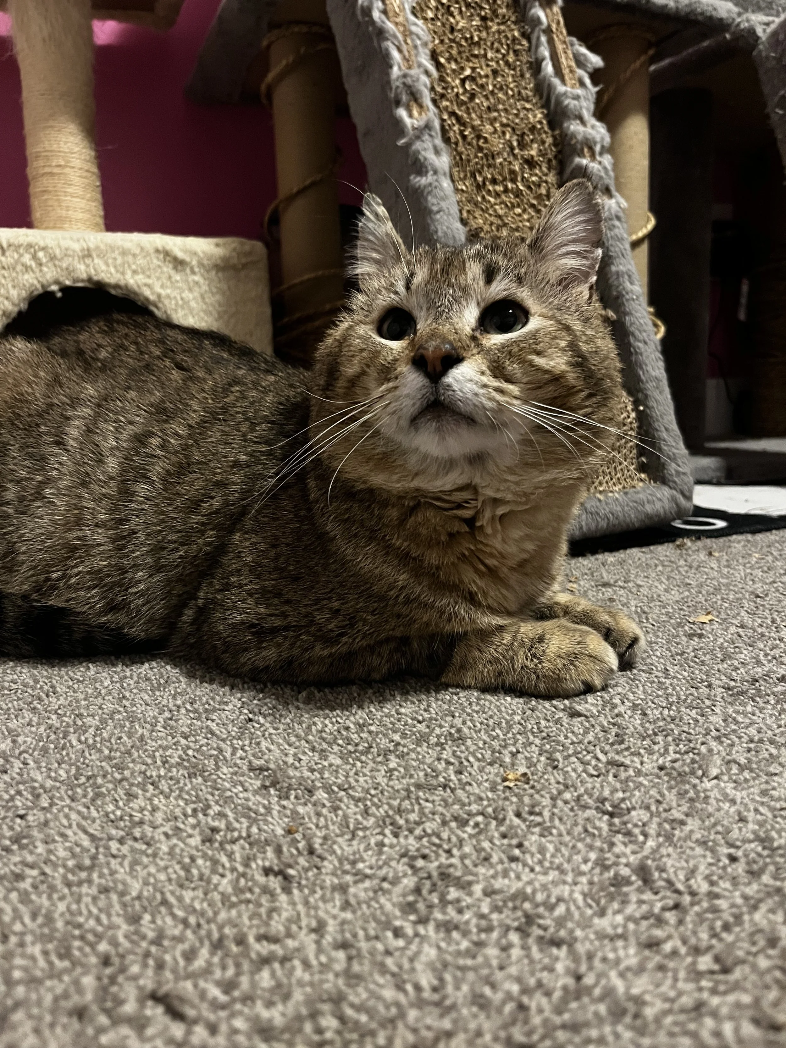 Meet Peeta, a handsome brown tabby boy with a gentle heart and a story of resilience. Coming from the large Wynyard situation, Peeta is still learning that the world can be a safe and loving place, and he continues to make progress with his socialization every day.