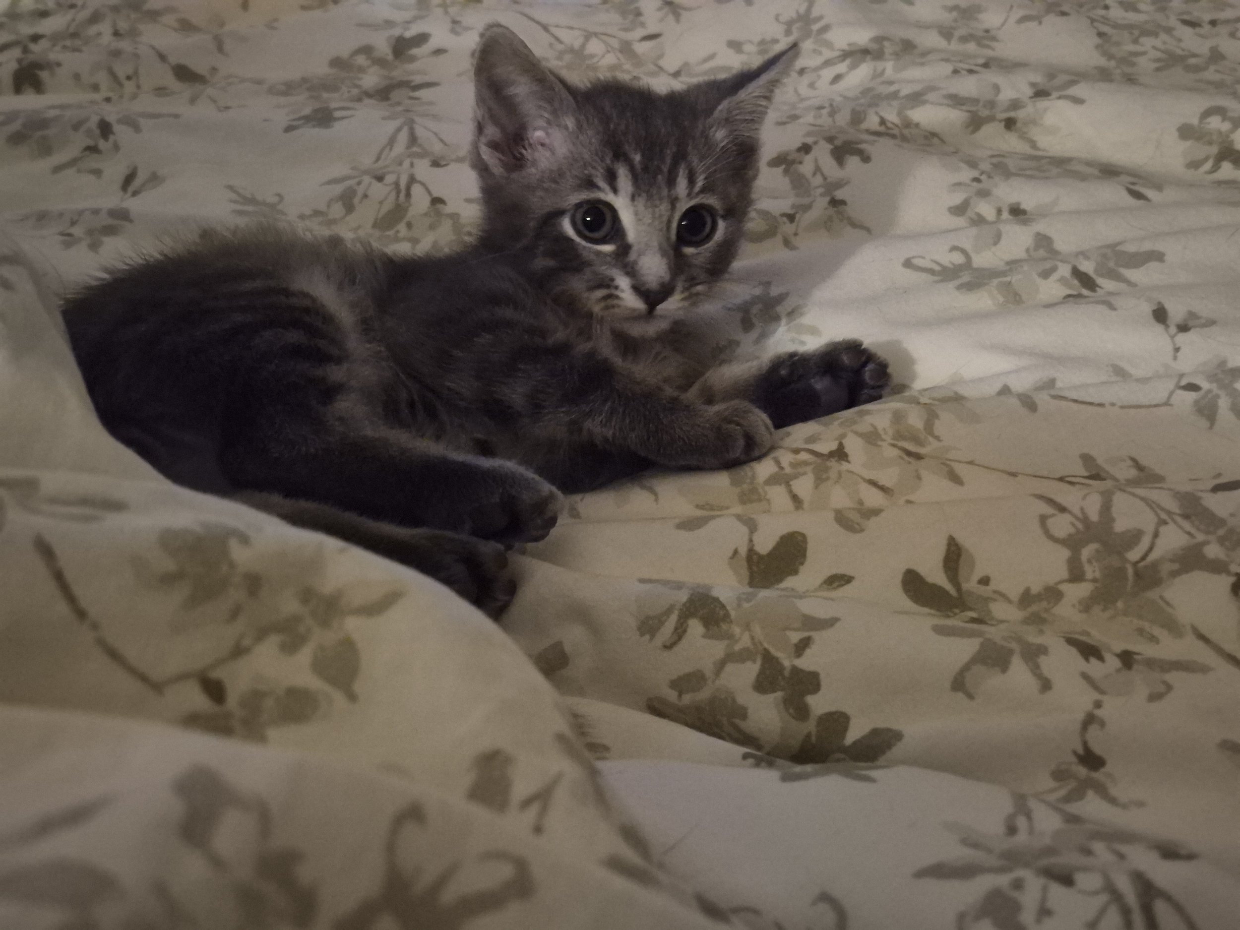 Quiggley is a very lively, confident kitten, who took over the mothering role with her siblings, she is perhaps a wee bit bossy. She is also very cuddly and loves to curl up, purr and make biscuits. She really does need an active playmate, she's very busy.