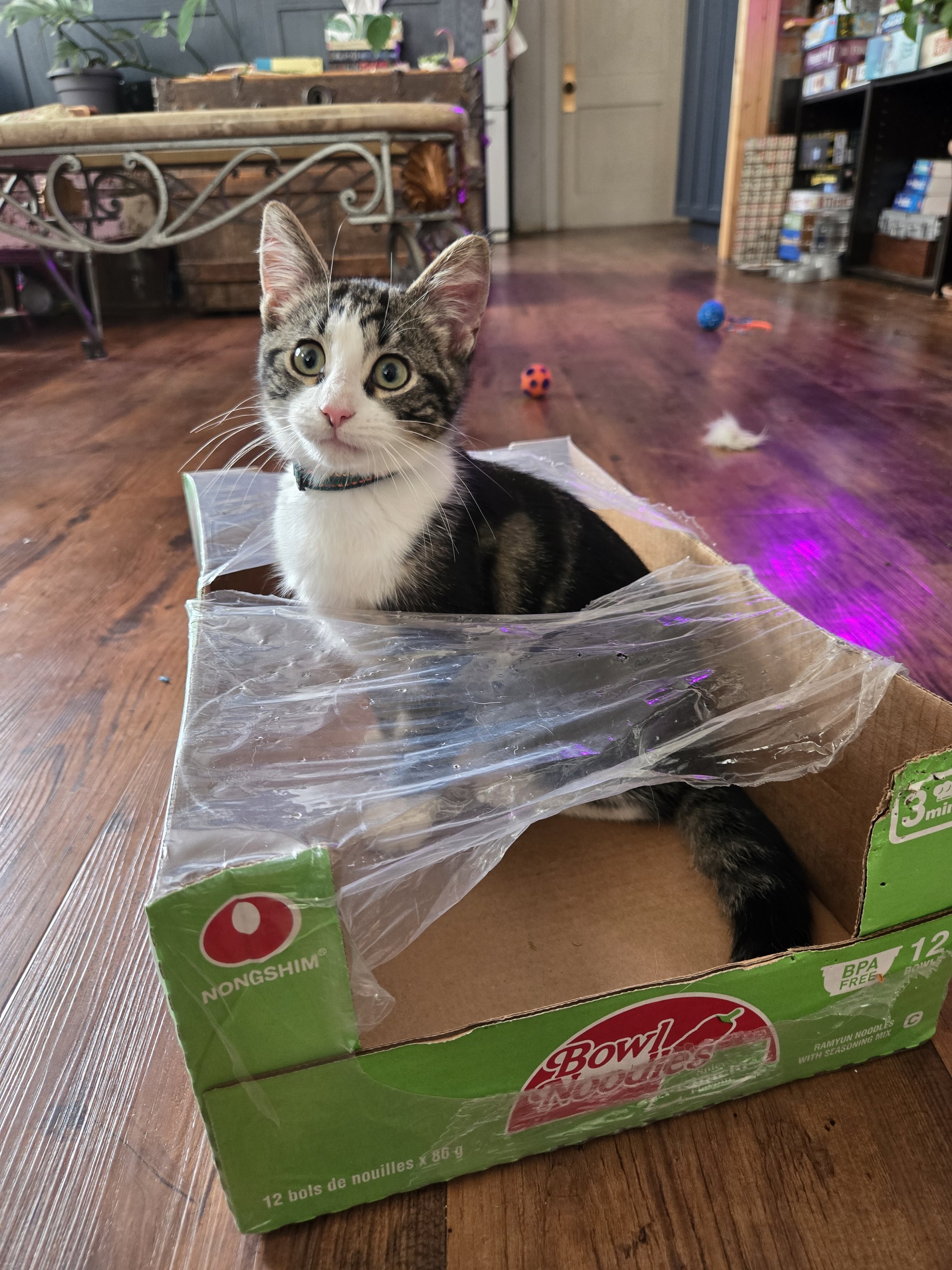 This little guy is litterbox trained. He mostly ignores houseplants. And he is generally quite good about using his scratch pads.