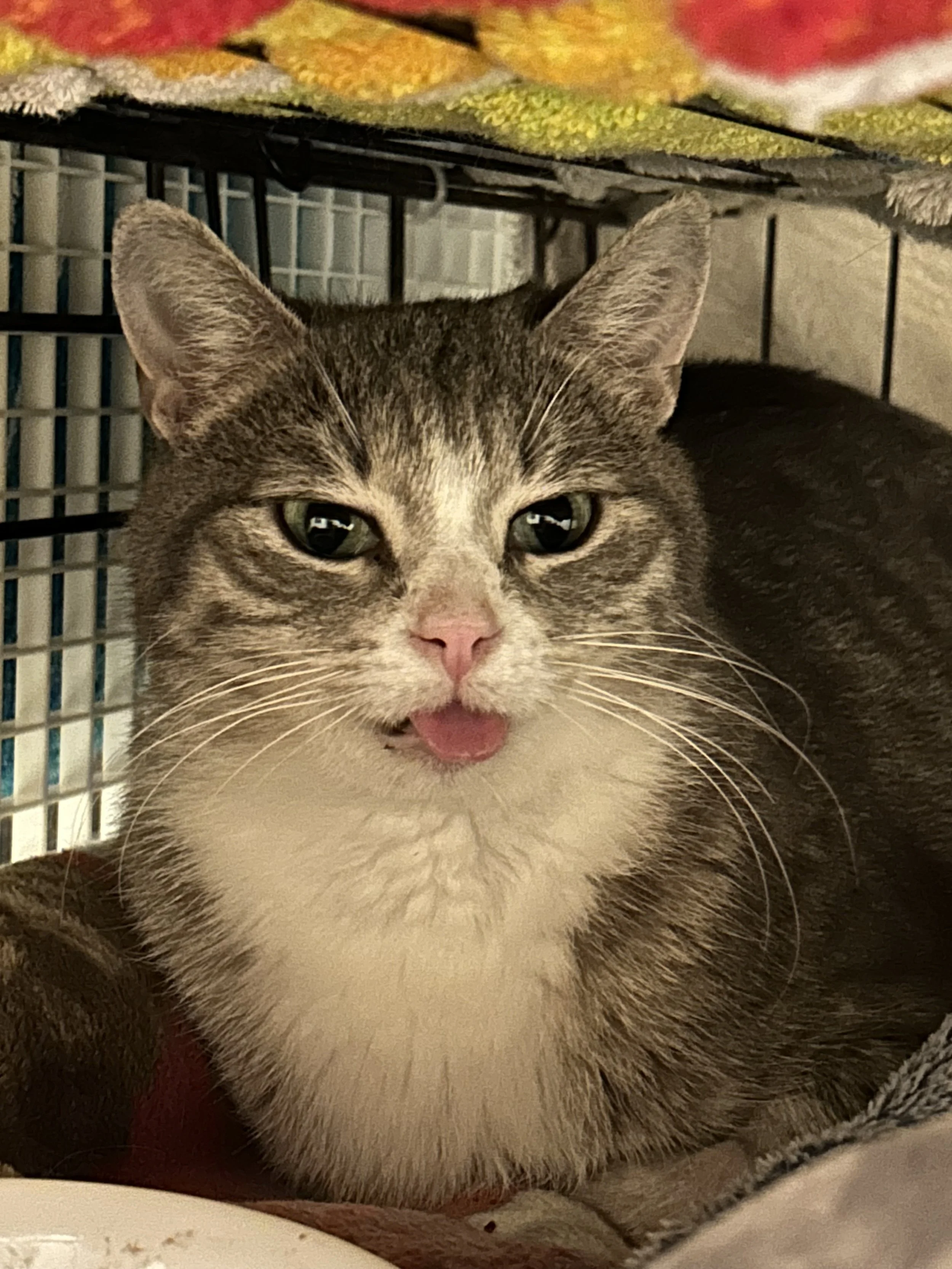 She is a small cat, probably from lack of food and having kittens while she was a kitten herself. It was discovered that she had severe dental disease, so after she recovered from her spay, she had to have a second surgery to remove all her teeth.