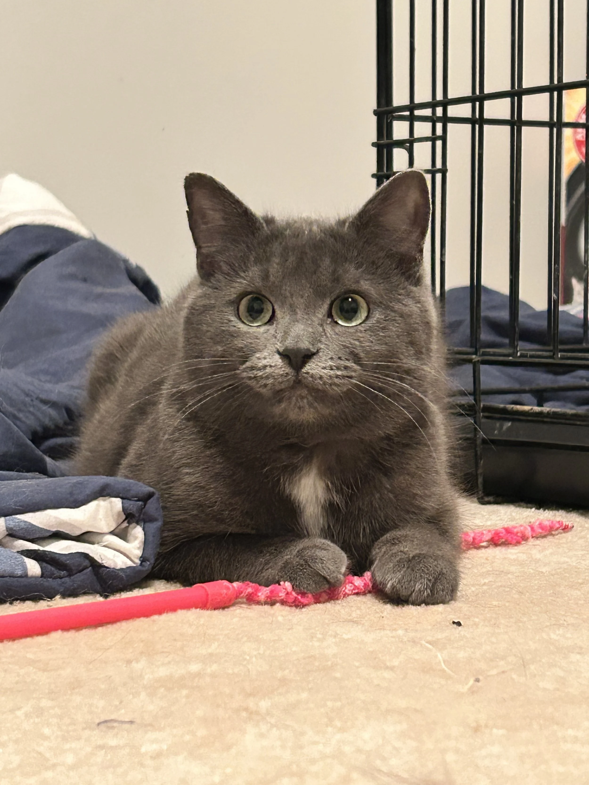 Saki may be timid but she is always up to play, she enjoys playing with the wand, sometimes if you’re lucky she will play with her mouse while you’re with her. She will also come to you when she knows you have her favourite churu, she will even eat it off your hand. She is still a little nervous when you approach her, and will accept some pets.