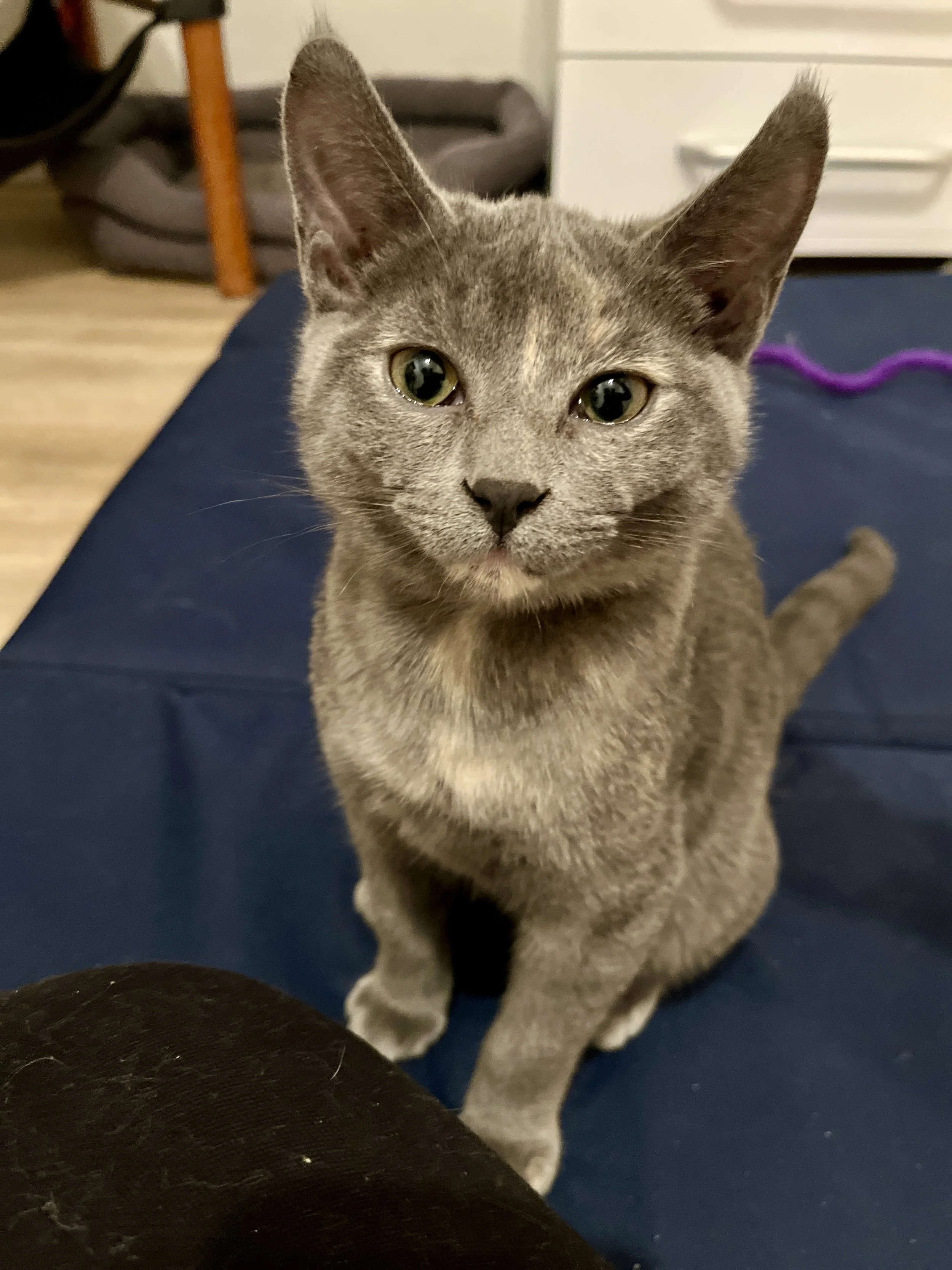 While her siblings demand attention with chirps and throwing their whole selves onto you with gusto like tiny torpedoes, Tiggy's method is to sit quietly beside you, maybe putting a paw on your lap, until you notice her and invite her for snuggles.