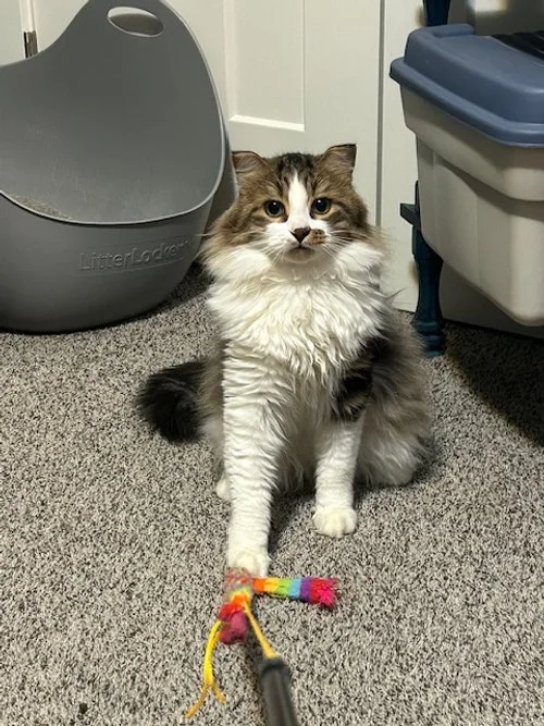I am super playful and love wand toys- Once I get them in my teeth I try and run away with them! I love when my foster plays with me throwing balls - and I can entertain myself for hours with my roller ball toy!