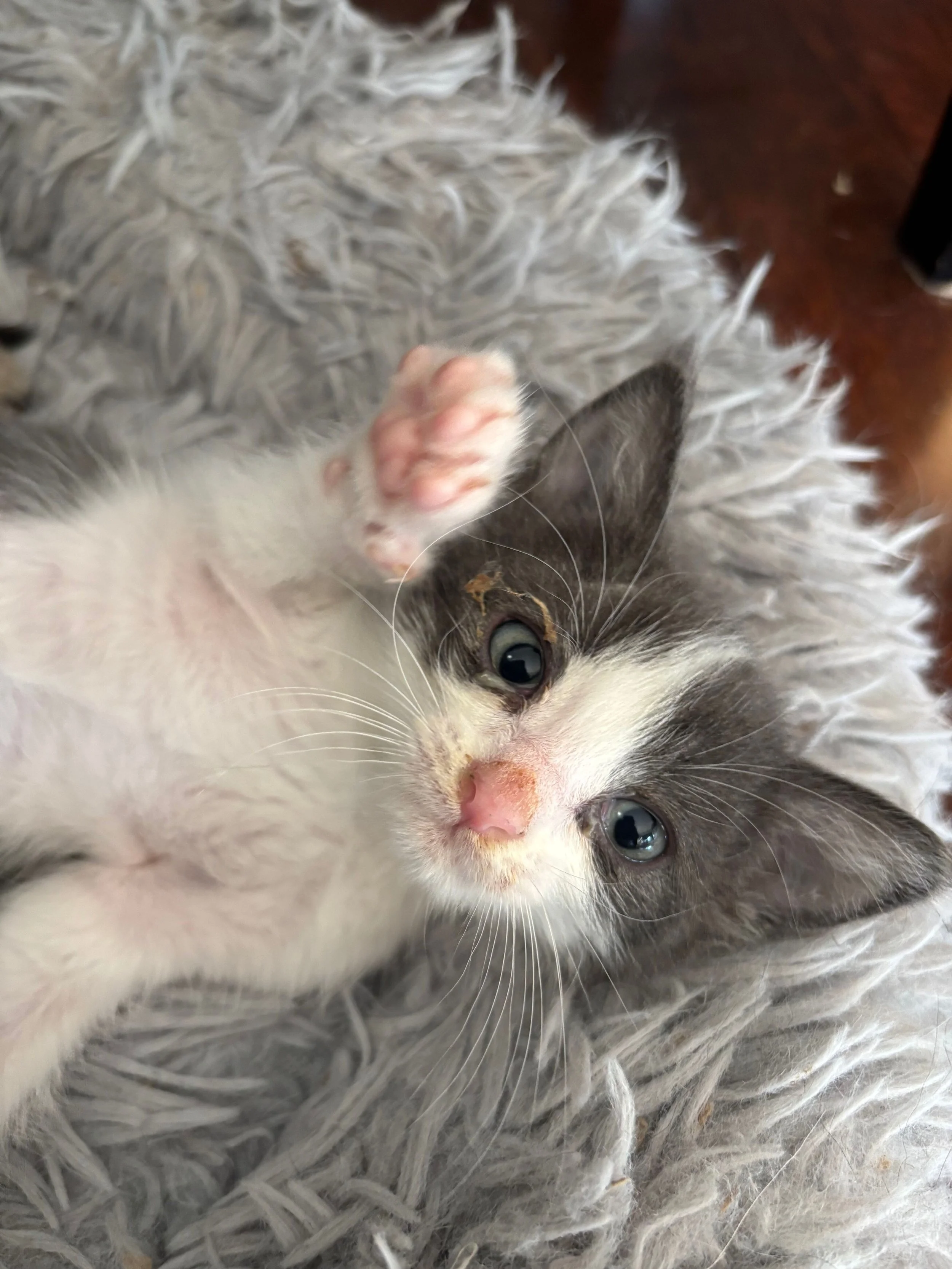Vienna is a little gray-and-white boy kitten with a big heart and an even bigger sense of adventure. He loves exploring new places and trying new things, even if he sometimes gets a bit left behind by his faster siblings. He never gives up—he just trots along happily and keeps discovering the world at his own pace.